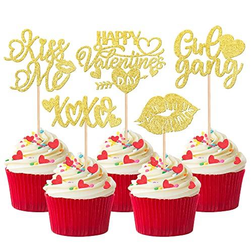 30 PCS Happy Valentine's Day Cupcake Toppers Glitter Lips Kiss Me Love heart Be Mine Cupcake Picks for Valentine's Day Theme Wedding Bridal Shower Birthday Party Cake Decorations Supplies Gold