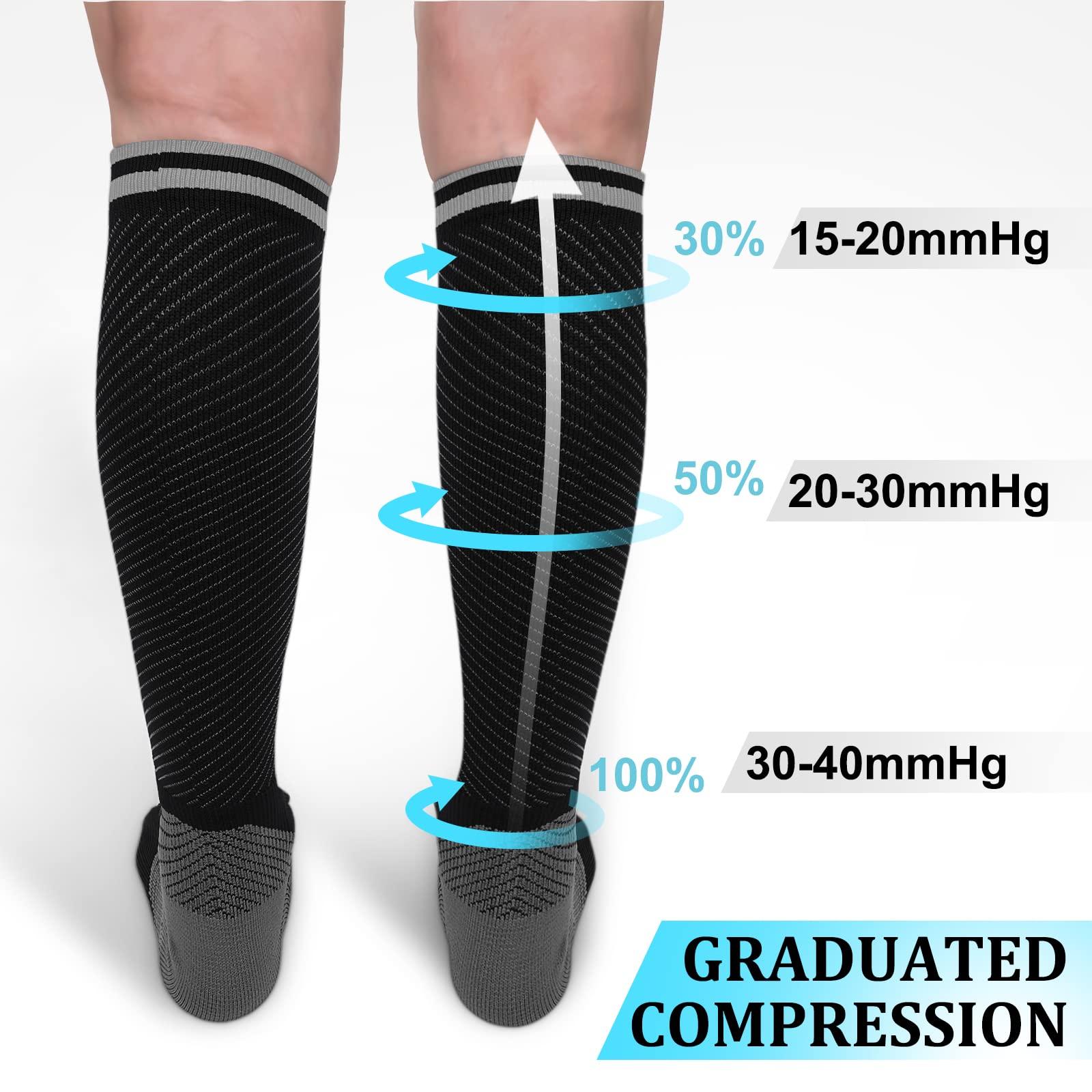 - GRADUATED COMPRESSIONTailored to the right pressure for your calf every parts.The circulation pressure gives a more comfortable experience to you.Pressure Value: Foot: 30-40mmhg, Ankle and Calf: 20-30mmhg,socks welt : 10-15mmhg.