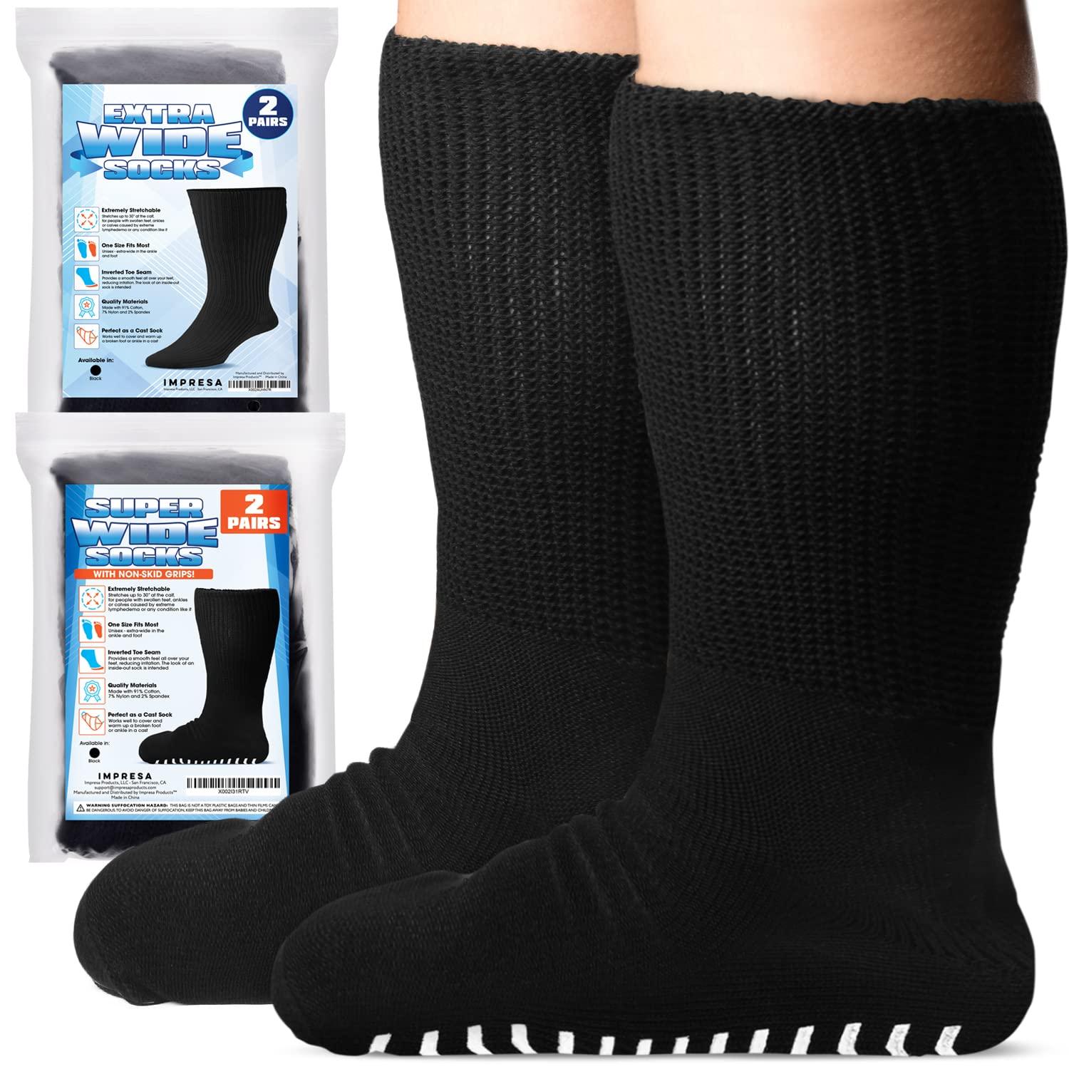 - Super Stretchy, Super Comfortable: Stretches up to 30 wide at the calf ideal for people seeking a non-slip diabetic sock, hospital sock or have swollen feet, ankles or calves caused by extreme lymphedema or any condition like it. Each package contains 2 pairs with non-skid grips plus 2 pairs without grips. All are in the color black