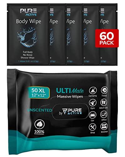 Pure Active 60 Individually Wrapped Shower Body Wipes + 50 Extra Thick Unscented Shower Wipes, Camping Wipes For Bathing, Rinse Free Body Cleansing Wipes