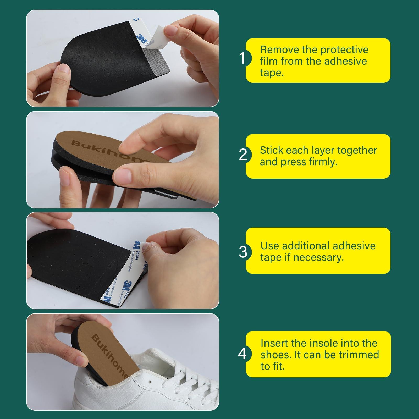 - Adjustable Height :The heel lifts for men and women feature an adjustable height with four layers, each measuring 1/4" in height, for a combined total of 1 inch.This allows you to customize the height by adding layers as needed. In addition, our shoe lifts come with 6 strong adhesive tapes.The strong adhesion ensures that each layer of the lift is tightly bonded together and won't come apart over long periods of time.