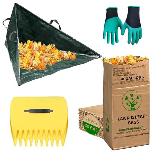 - [Complete Package] 1x Leaf Collector Tripod Bag, 10 x Lawn leaf bags, 1 pair of leaf scoop, 1 pair of Garden Gloves.