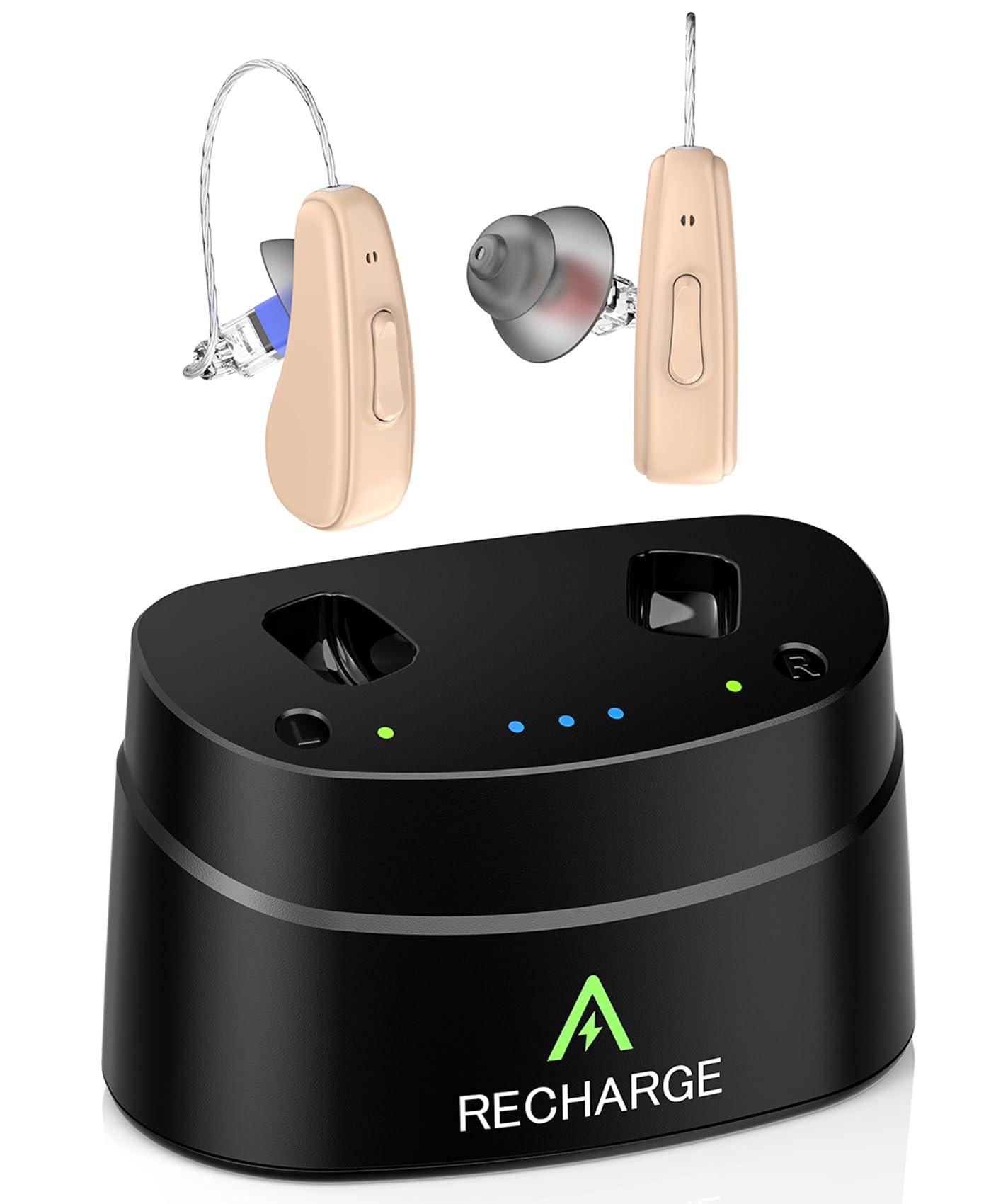 - Efficient Charging, Extended HearingEfficient Charging, Extended Hearing:Fully charged within 2 hours, the hearing aid lasts for over 30 hours. The charging case holds an additional 180 hours of backup power, allowing approximately 6 extra charges for two hearing aids. The charger includes overcharge protection circuitry, eliminating concerns about overcharging.