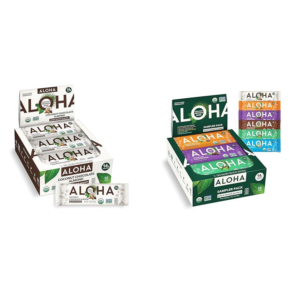 ALOHA ALOHA Organic Plant Based Protein Bars, Coconut Chocolate Almond, 1.98-Ounce Bars (Pack of 12) & Organic Plant Based Protein Bars - 6 Flavor Variety Pack - 12 Count, 1.9oz Bars - Vegan Snacks