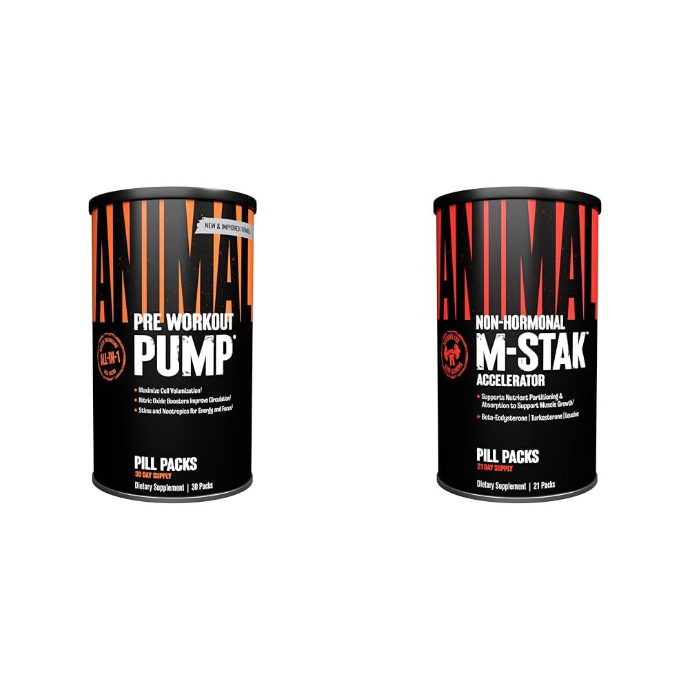 This 2-piece bundle combines Animal Pump preworkout with Animal M-Stak muscle builder for powering your toughest workouts. Animal Pump provides energy, pumps, and focus in convenient single-serve packs. It contains creatine, arginine, green tea extract and other key ingredients to boost nitric oxide levels. The stimulant pill can be removed to customize your energy level. Animal M-Stak is a 21-day muscle building stack designed for "hard gainers" who struggle to add mass. Its 6 complexes help maximize nutrient utilization for lean muscle growth through nitrogen retention and nutrient partitioning. Just take a pack 30-45 minutes pre-workout or between meals on off days. With the legendary Animal brand trusted by pros for over 30 years, this bundle offers a preworkout and muscle builder that work synergistically to help you power through workouts, retain nitrogen, partition nutrients, and ultimately build lean muscle.