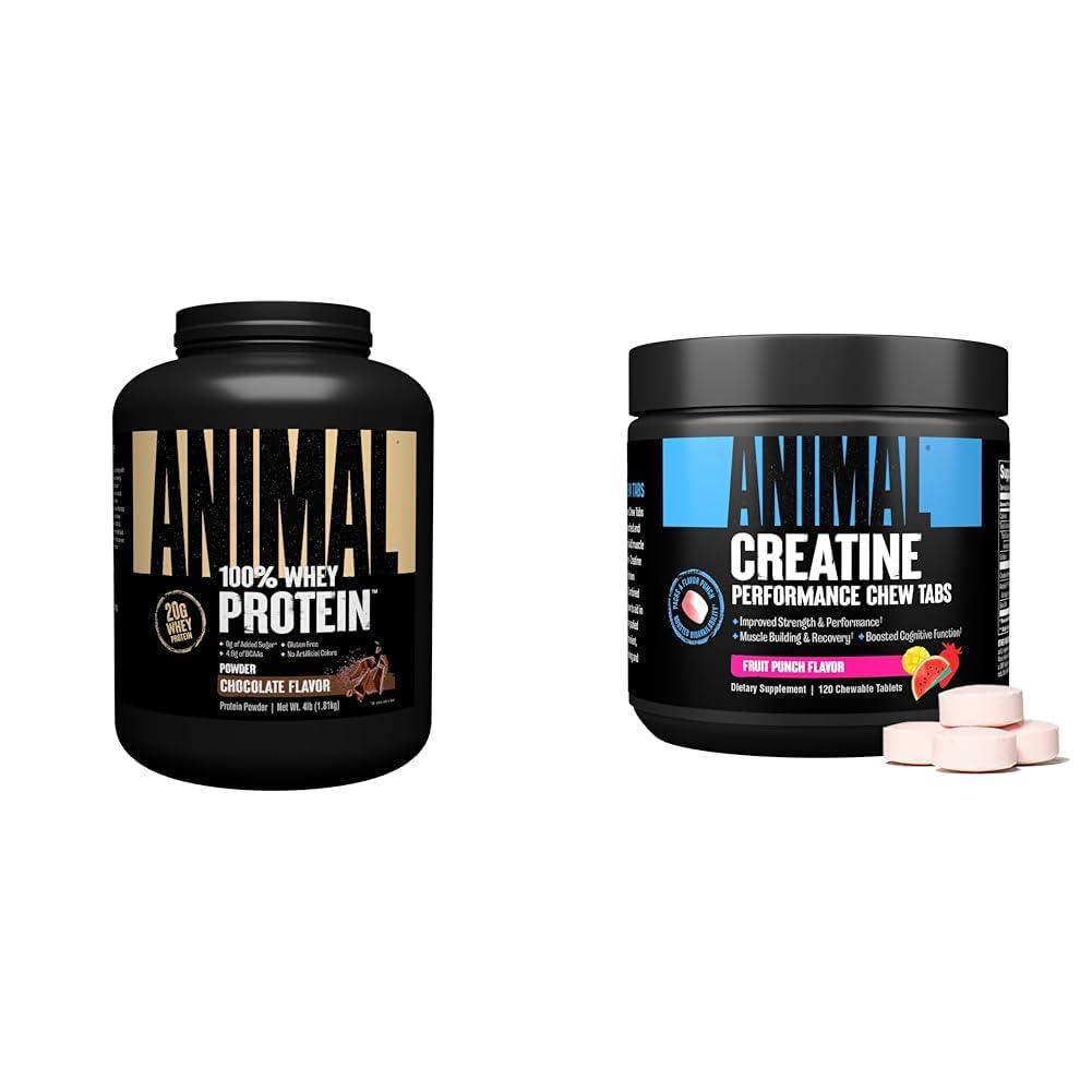 This protein and creatine bundle combines two complementary supplements to help fuel your workouts and recovery. The Animal 100% Whey Protein Powder provides a concentrated 20g dose of protein per scoop to support muscle growth and repair. With over 4.6g of BCAAs and only 1g of sugar, it can be mixed easily into a tasty, anytime protein boost. The Animal Creatine Chews deliver 5g of creatine monohydrate per serving in a convenient, grab-and-go chewable form. Creatine helps increase strength, boost endurance, improve workout performance, and promote muscle energy. This specially formulated creatine also includes sea salt and patented ingredients for better absorption. Together, these two products deliver the protein and creatine needed to support your fitness goals. The whey protein powers muscle recovery while the creatine unlocks strength and endurance gains. Produced in a GMP facility and third-party lab tested, these premium supplements complement each other to take your training to the next level.