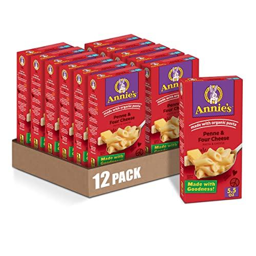 - Contains: Twelve 5.5 oz boxes of Annies Four Cheese Penne Macaroni and Cheese Dinner with Organic Pasta
