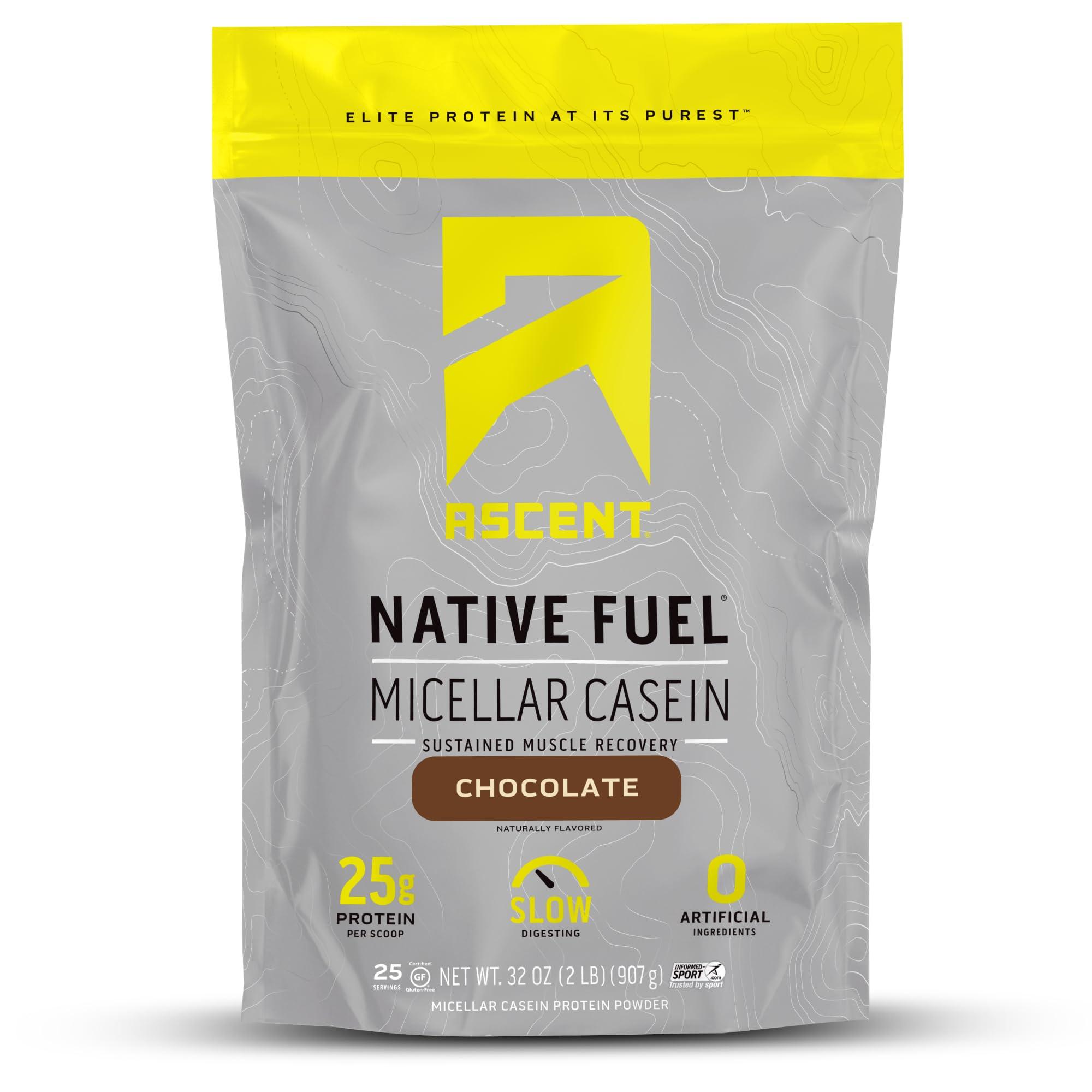 Ascent Casein Protein Powder - 25g Micellar Casein Powder with Zero Artificial Flavors & Sweeteners, Gluten-Free, No Added Sugar, 4.9g BCAA, 2.2g Leucine - Chocolate, 2 Pounds