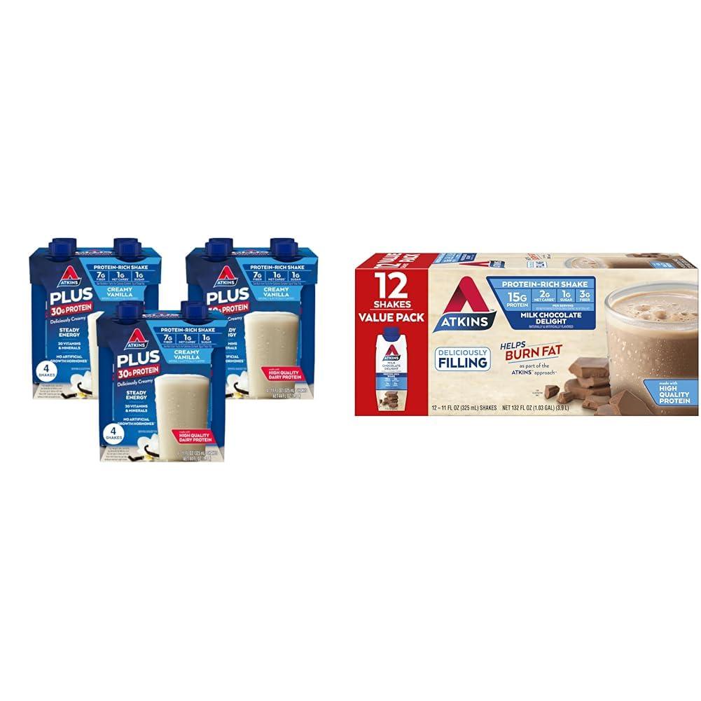 - Product 1: AT HOME OR ON-THE-GO; Atkins Plus Creamy Vanilla Protein Shakes; Enjoy delicious shakes that fit right into your busy schedule, with 30g of protein, 1g of net carbs, and 1g of sugar per serving; This is Todays Atkins