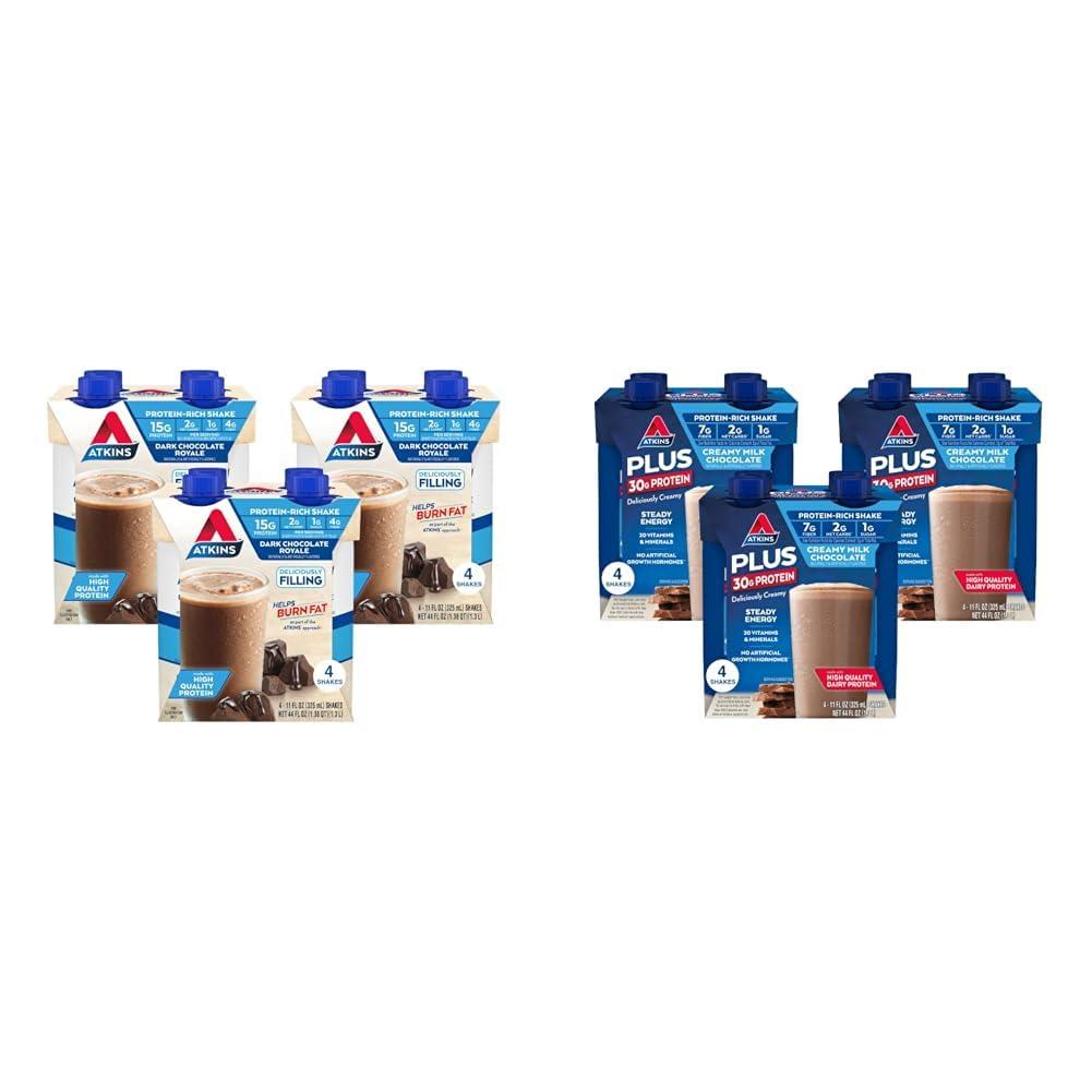 - Product 2: Atkins Creamy Milk Chocolate PLUS Protein Shake, 30g Protein, 7g Fiber, 2g Net Carb, 1g Sugar, Keto Friendly, Low Carb, High Protein Drink, 12 Count