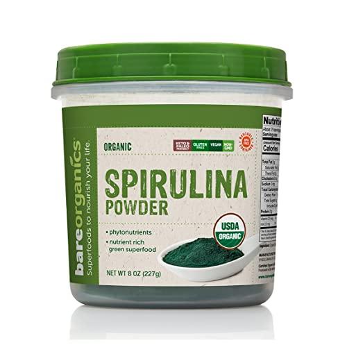 At Bare Organics, our mission is simple, just like our foods. Were all about real nutrition for real people. We want to help you meet your daily nutrition goals, feel energized, and know that youre getting your nutrients from the best raw, organic sources.A source of naturally occurring iron and a great natural immunity booster, raw spirulina powder is quickly becoming one of the most popular superfoods of this era. Our 100% raw spirulina powder is one of the best daily whole food supplements. It is extremely nutritious and is known to have the highest concentration of protein compared to any other plant foods. This organic spirulina powder is a powerhouse of antioxidant properties. It is full of protein, chlorophyll, minerals, and vitamins which help reduce fatigue and boost stamina. Our USDA certified organic whole food supplement consists of vegan and gluten free ingredients. Our spirulina powder is completely GMO-free and has no added sugars or preservatives. You can add our raw spirulina powder to smoothies, curries, protein shakes, soups, juices etc. It can also be combined with other ingredients for a wholesome and nutritious meal.Packaging Details: every container of Bare Organics is 100% recyclable, BPA-Free and reusable. Each jar contains 227 g of gluten free raw spirulina powder. These statements have not been evaluated by the Food and Drug Association. This product is not intended to diagnose, treat, cure, or prevent any disease.Safety Warning: If You Are Pregnant Or Lactating, Consult A Health Care Professional Before Using This Product. Keep Out Of Reach Of Children. Store In A Cool, Dry Place Away From Sunlight And Moisture. Do Not Use This Product If Tamper Evident Tab Has Been Removed Or Is Broken. Note: Silica Packet Included To Help Maintain Freshness. Do Not Consume. This Product Is Labeled To United States Standards And May Differ From Similar Products Sold Elsewhere In Its Ingredients, Labeling And Allergen Warnings.