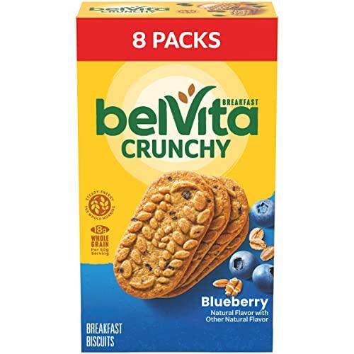 Start your morning off right with lightly sweet and crunchy belVita Blueberry Breakfast Biscuits. These bulk breakfast biscuits combine wholesome grains with fruity blueberry flavor for a delicious breakfast. Specially baked, these baked biscuits contain slow-release carbs that break down gradually in the body to deliver delicious, steady energy all morning long so you can enjoy these with your morning coffee, yogurt and fruit or as an instant breakfast food no matter what the morning brings. Each 50 gram serving of these bulk breakfast cookies contains 18 grams of whole grain, 2 grams of fiber and B vitamins for a delicious alternative to breakfast bars. A simple addition to your morning, these cholesterol-free bulk biscuits for breakfast contain no high-fructose corn syrup and no artificial colors, flavors or sweeteners. What are you waiting for? These convenient breakfast biscuits made with wholesome grains are a great alternative to traditional breakfast snacks. This bulk breakfast food is also an energizing alternative to snack bars and a wholesome addition to college care packages. Each individual pack contains four belVita Blueberry Breakfast Biscuits for you to enjoy on the go, at the office or at home for lasting morning energy.