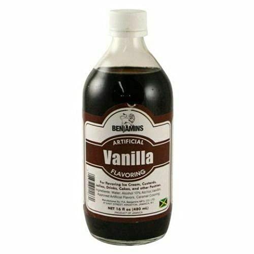 Artificial flavoring. For flavoring ice cream, puddings, jellies, drinks, cakes and other confections. www.pabenjamin.com. Product of Jamaica.