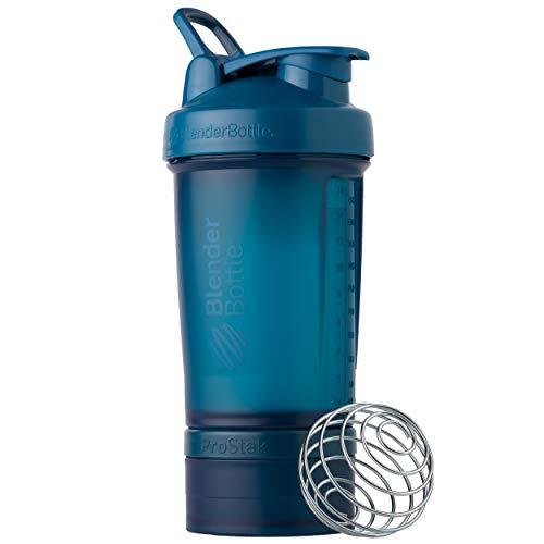 An all-in-one protein shaker and storage system for serious athletes. The BlenderBottle ProStak shaker combines a durable, leak-proof shaker bottle with interlocking storage containers, making it easier than ever to carry nutrition and supplements on the go. The bottle boasts an updated ProSeries lid, featuring a SpoutGuard to keep the mouthpiece clean, a secure flip cap, and a wide carry loop for easy portability. The powerful mixing system utilizes the BlenderBall wire whiskfound only in BlenderBottle brand shakersto mix even the thickest ingredients for smoothies, protein shakes, and meal replacements. Attached interlocking Twist n' Lock jarscomplete with individual lids and a space-saving pill organizer keep supplement powders, snacks, and pills in place. Additional jars (sold separately) offer unlimited storage expandability. Includes 22-oz. capacity BlenderBottle shaker, 150cc jar, 100cc jar, pill organizer, and patented BlenderBall wire whisk. BPA and phthalate-free, top-rack dishwasher safe. Manufacturers limited lifetime warranty.