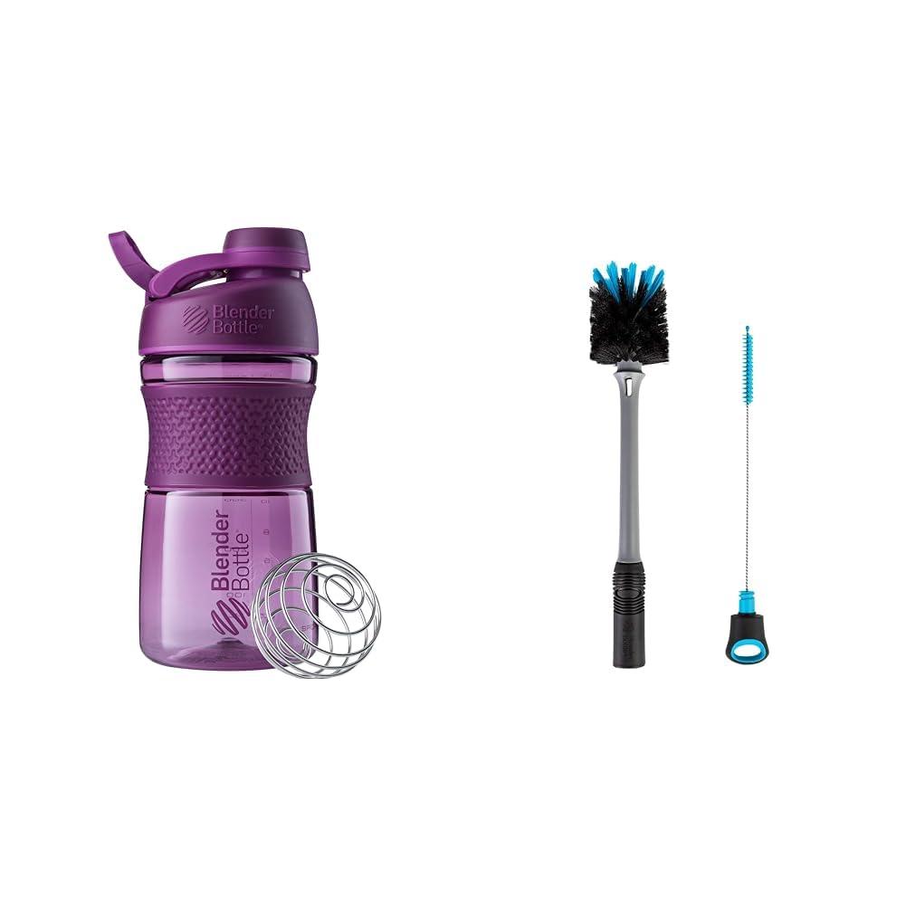 BlenderBottle SportMixer Shaker Bottle Perfect for Protein Shakes and Pre Workout, 20-Ounce, Plum & 2-in-1 Shaker Bottle and Straw Cleaning Brush, 1 Pack,Gray