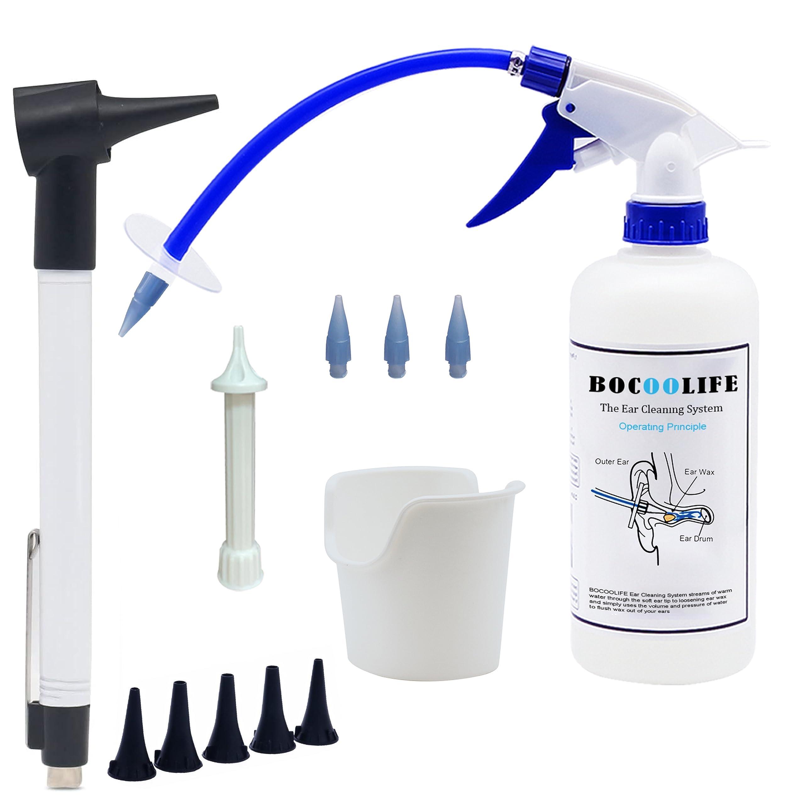 BOCOOLIFE Ear Wax Removal Kit, Ear Cleaning Kit Ear Washer Irrigation Flushing System, Ear Basin & 3 Ear Tips,Easy to Operate,Safe and Effective to Clean Ear Blockage of All Ages. BOCOOLIFE ear flush wax removal kit, wax blockage is one of the most common causes of hearing loss. can also lead to earache, ringing in the ear, itching, odor, and discharge.This is often caused by attempts to clean the ear with cotton swabs. Most cleaning attempts merely push the wax deeper into the ear canal,causing a blockage. If not cotton swabs, is there other way to clean your ear more safe and effective? According to the American Academy of Otolaryngology(ear, nose, and throat specialists), irrigation or ear syringing is a much better solution. The BOCOOLIFE Ears Wax Removal Tool can deal with it perfectly. Avoid expensive doctor's bill. The ear Cleaning System is easy to use at home. Simply fill 1/4 of the bottle with 3% hydrogen peroxide, and the rest with very warm water. Attach one of the washing tips, stay seated,and pump the solution into your ear. it's so easy to clean your ear. Operating Principle- The soft ear tip passes through the ear wax,inject the liquid into the cochlea. When the liquid meets the eardrum, it flows back,and flush the ear cerumen wax out from ear. Package Includes - Ear Spray Bottle - 1, Ear Basin -1, Extra Ear Tips - 3 and Portable Ear Canal Examine Tool - 1 set.