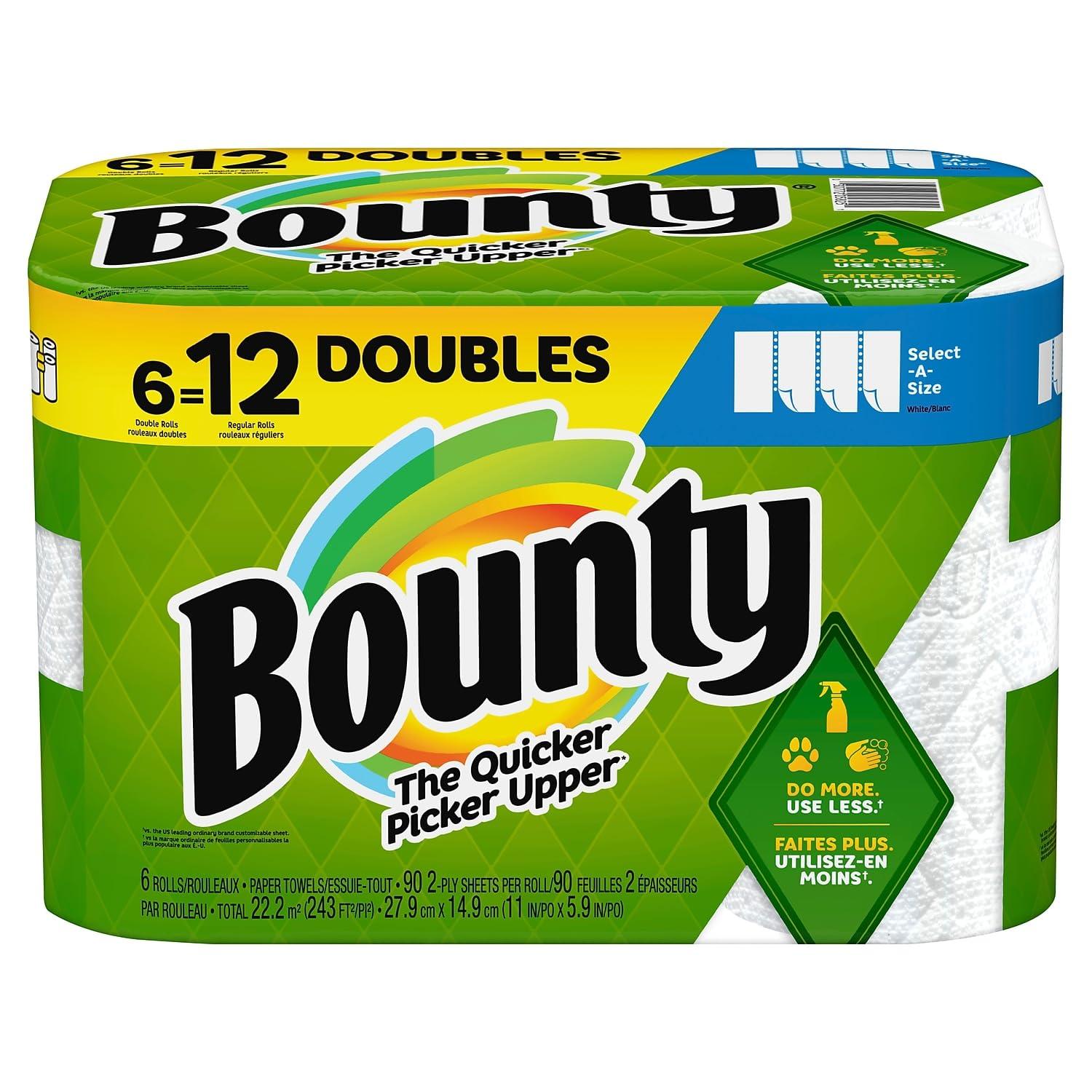 Clean up different-size messes with this carton of six Bounty Select-A-Size white paper towels rolls. Tackle spills and accidents with this carton of six rolls of paper towels. Each sheet has convenient perforations to match the correct size to the mess, and the two-ply design absorbs more than regular napkins. These Bounty Select-A-Size paper towels are strong even when wet to safeguard against tearing. Kitchen roll towels for drying hands or cleaning up messes. 110 sheets per roll, 6 rolls per carton (660 sheets total). 2-ply for absorbency and strength. White sheets look clean and sanitary.