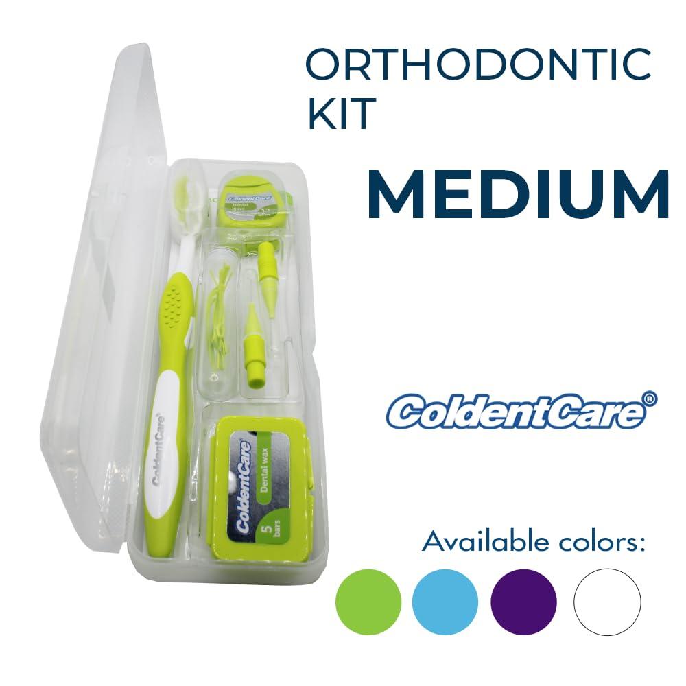 The Coldentcare Braces Cleaning Kit for Teeth is a portable orthodontic toothbrush kit that includes various dental care tools to maintain oral hygiene, especially for individuals with braces or orthodontic appliances. Here is a breakdown of the kit's contents and features: Toothbrush: Features 008" toothbrush bristles, suitable for effectively cleaning teeth and gums. Medium texture for a comfortable brushing experience. Non-slip texture on the handle for a secure grip and precise control during brushing. "V" trim design on the bristles to reach difficult-to-access areas and ensure thorough cleaning. Two-component polypropylene and rubber handle for durability, comfort, and optimal brushing control. Comes with a bristle protector cap to maintain hygiene and protect the bristles when not in use. Dental Floss (12m): Includes a generous 12 meters of dental floss to aid in effective plaque removal and promote healthy gums. Orthodontic Wax (5 bars): Five bars of orthodontic wax are provided to help alleviate discomfort caused by braces or orthodontic appliances. The wax acts as a protective barrier between the mouth and the appliances. Dental Floss Threaders (13): The kit includes 13 dental floss threaders, which are useful for navigating floss around braces, bridges, and other dental work, making flossing more accessible in complicated areas. Interdental Brushes (Conical - Cylindrical): Two interdental brushes with conical and cylindrical shapes are included in the kit. These brushes are effective for cleaning between teeth and along the gum line. Multipurpose Plastic Case: All the dental care tools are neatly organized and conveniently packed in a multipurpose plastic case, making it easy to carry during travel or for daily use. Available Colors: The dental care kit is available in three different colors: Green, Blue, and Purple. This comprehensive dental care kit is designed to provide essential tools for maintaining oral health.
