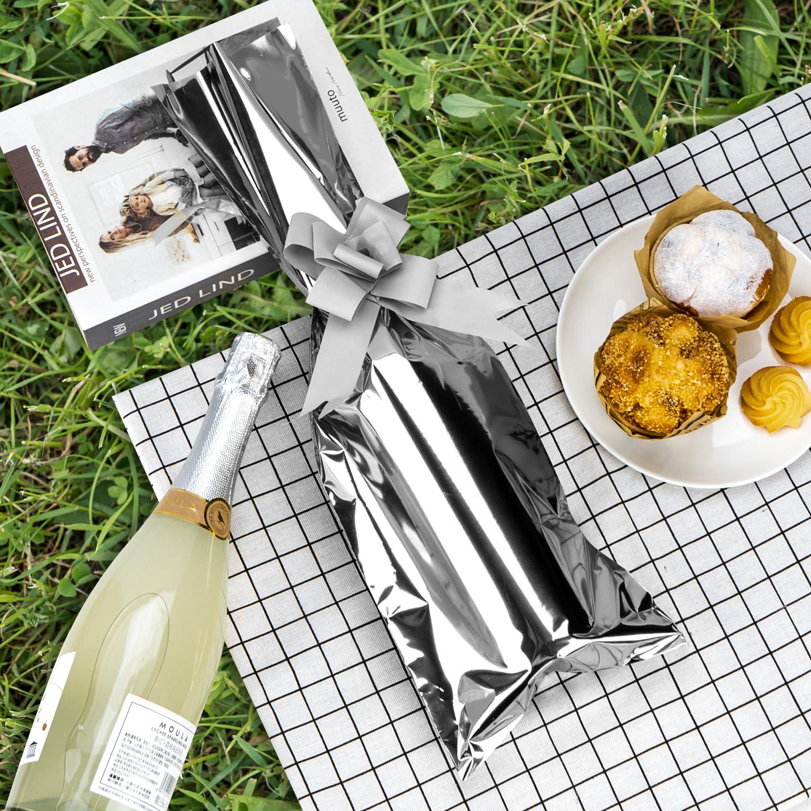 - Wine bottle gift wrapping bags are made from metallic mylar foil, sturdy, heat sealable, and with pull bows for gift wrapping.