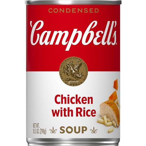 Cozy up with a steamy bowl of Campbell's Condensed Chicken and Rice Soup. A family favorite for generations, this delicious chicken soup is crafted with perfectly seasoned golden chicken stock, rice, carrots and tender chicken meat with no antibiotics. The result is a soul-warming chicken with rice soup that brings a smile with every spoonful. Top it with Pepperidge Farm Golden Butter Crackers, season it with fresh herbs, or pair it with a sandwich or salad for something quick and easy. This convenient canned soup is a year-round pantry staple and the perfect comfort food on a chilly day or when you're feeling under the weather. Simply mix the condensed soup with 1 can of water and microwave on high for 2.5 to 3 minutes in a covered, microwave-safe bowl, or heat in a pot on the stove, stirring occasionally. Each 10.5 oz recyclable can contains about 2.5 servings of microwave soup and features a non-BPA lining. From Chicken With Rice to Cream of Mushroom and everything in between, Campbell's makes delicious soups in flavors your family knows and loves, with quality, farm-grown ingredients in every can. M'm! M'm! Good!