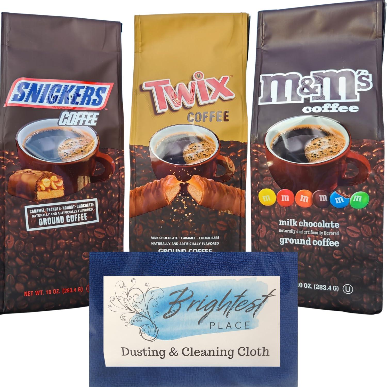 - Bundle Includes: Brightest Place Microfiber Clean Up Cloth, 1 bag of Snickers Flavored Ground Coffee, 1 bag of Twix Flavored Ground Coffee, and 1 bag of M&M\'s Flavored Ground Coffee