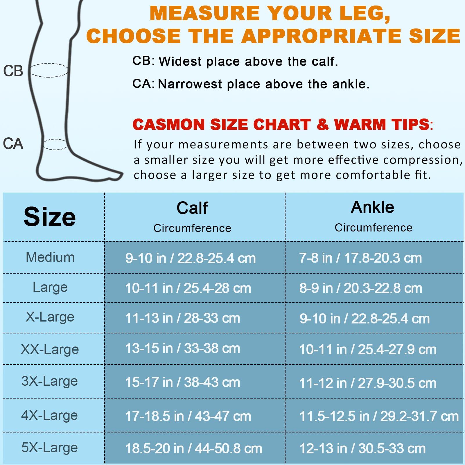 - MULTIPLE SIZES: These closed toe zipper compression socks sizes from medium to 5X-Large, which allows people with severe calf swelling and larger calf sizes to choose the right size. Casmon zipper compression socks 20-30 are designed to fit your feet perfectly, whether you're petite or plus size. Utilizing specialized German fabricating machinery and high-quality fabrics ensure the durable and opaque socks can offer comfort for adults.