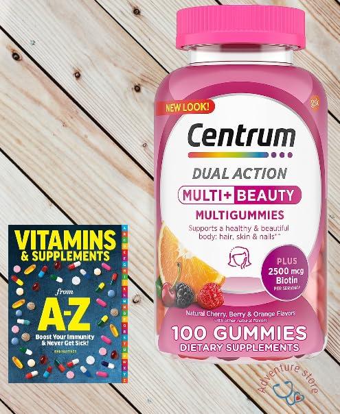 Give your body what it wants, all in one convenient bottle, with Centrum Multi+ Beauty Dual Action Gummy Multivitamin, a gummy filled with 12 essential nutrients. Each gummy is formulated with 12 nutrients to support overall wellnessincluding B-Vitamins, vitamin D, calcium and antioxidants (5). Centrum MultiGummies support a healthy appearance (1) including additional biotin for hair, skin and nails. They also support strong bones (2), help support your daily energy needs (3), and support normal immune function (4)(5).These great-tasting gummies are gluten-free with no artificial flavors or sweeteners. Chew two gummy multivitamins once daily with or without food. (1) A combination of 12 nutrients helps support whole body health including Biotin, Vitamins A, C and E to help maintain healthy appearance including hair, skin and nails (5) (2) A combination of vitamin D and calcium helps maintain strong bones (5) (3) B-Vitamins support daily energy needs (5) (4) Vitamins C, E & Zinc support normal immune function (5) (5) This statement has not been evaluated by the Food and Drug Administration. This product is not intended to diagnose, treat, cure, or prevent any disease.