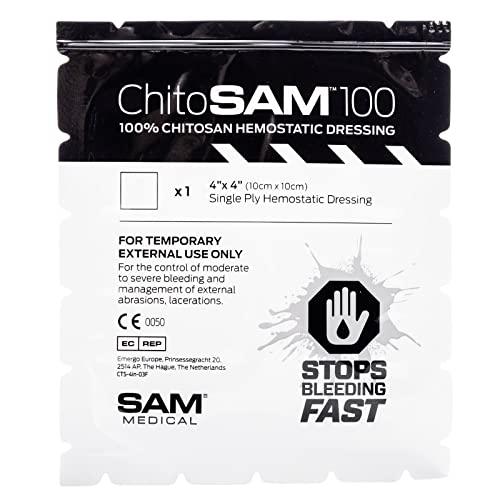 Current Lot Exp Date 12/2023 Chito-SAM 100 is a high performance 100% pure chitosan hemostatic dressing designed to stop lethal bleeding fast. It is easy to use, extremely effective, and safe. It is a CE Marked Class III Medical Device. Chito-SAM 100 works independently of the bodys normal clotting processes. Unlike most hemostatic dressings, Chito-SAM 100 is made of non-woven, 100% pure chitosan. The hemostatic performance is extremely effective compared to products impregnated or coated with chitosan hemostatic agents. New tear anywhere packaging allows you to quickly access the product. Simply open the packaging using any of the tear strips located along each edge. Dimensions: 6" H x 5" W x .25" D Weight: 0.4 oz