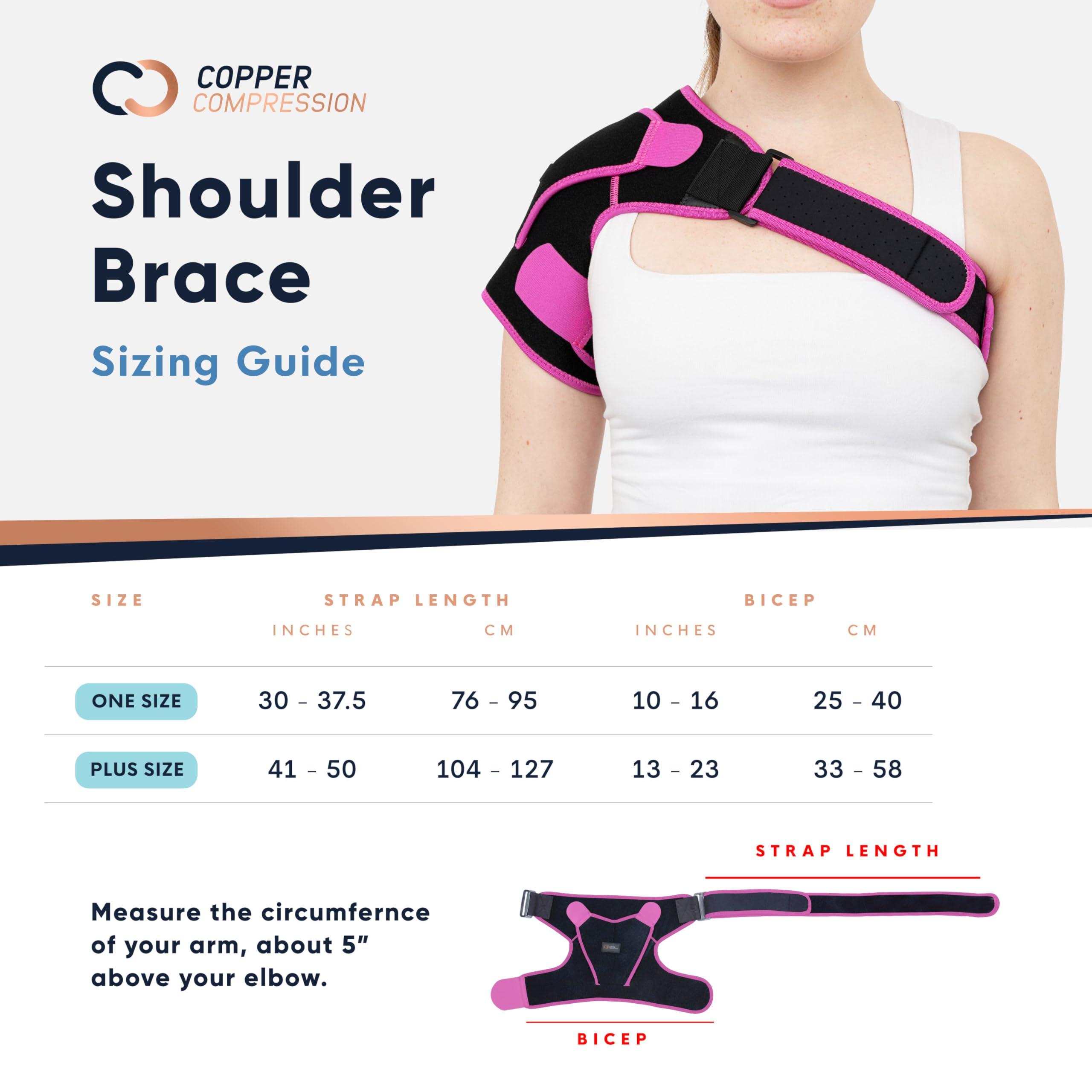 - ADJUSTABLE FIT. To determine your best starting size, refer to our sizing chart. The cross-chest strap lets you customize the shoulder sleeve as needed. It can be used with both right and left shoulders, for wide and narrow shoulders and chests. It fits men and women, tall and short, thin and heavy, young and the elderly. Perfect for sports injuries, age-related degeneration, disabilities of all kinds, post-SLAP surgery, broken humerus bones, and more!