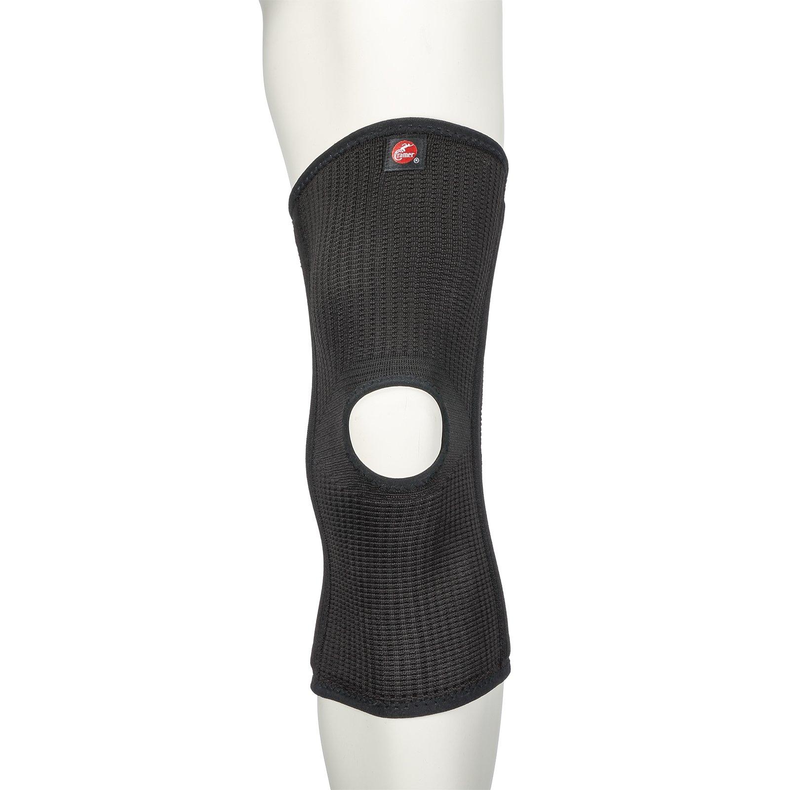 - Knitted polyester and spandex support features open patella to control patellar tracking with medial and lateral spiral stays for extended stability and support