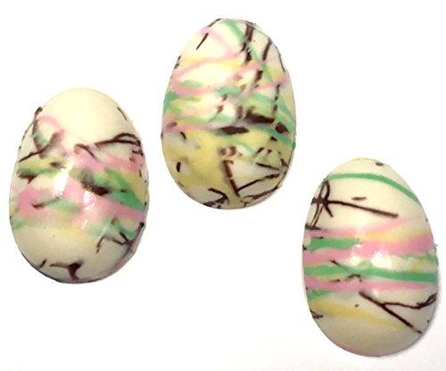 We decorate and hand pour these solid 1 oz white chocolate Easter eggs. They are flat on and side, "eggish" on the front!! Made in our confectionary kitchen in Ohio, available ONLY from us, made by us.