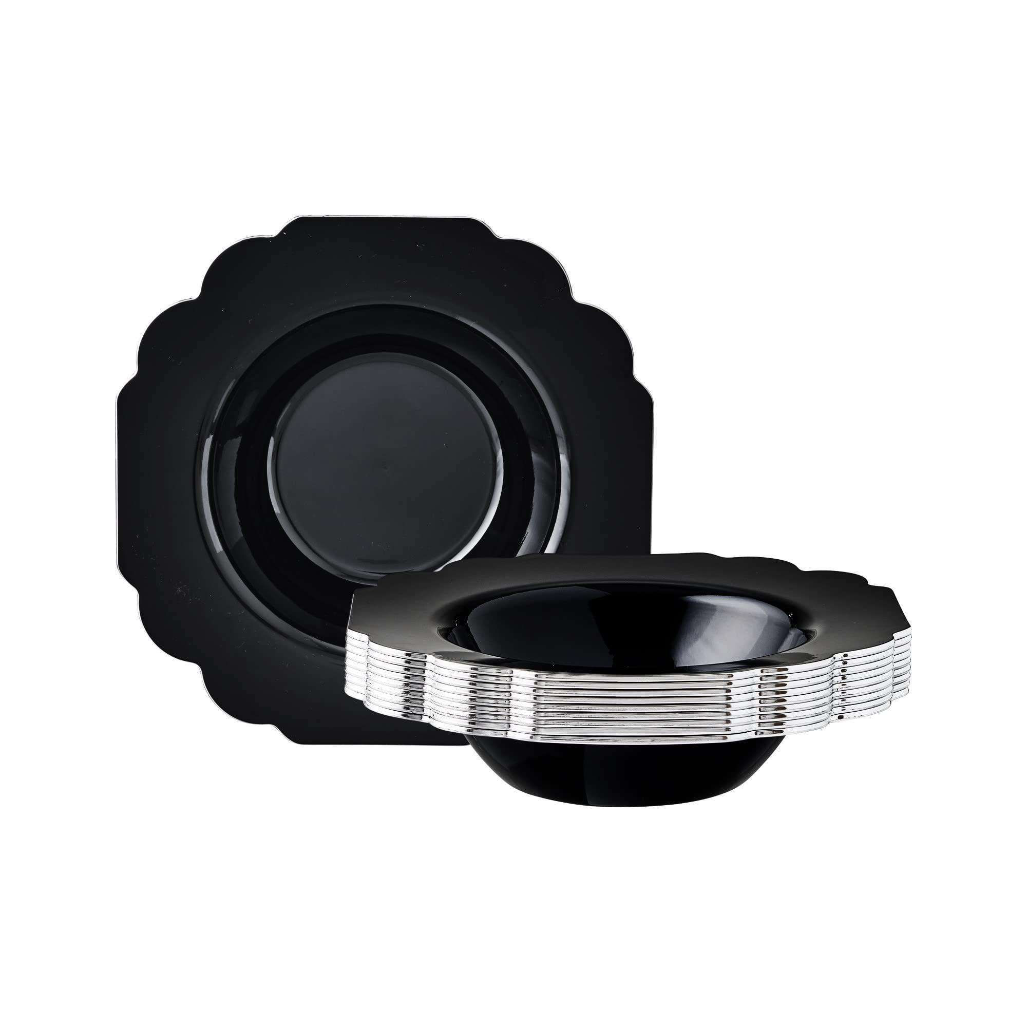 - SCALLOPED DESIGN: Attractive scalloped rims with fine silver edging is what makes this wedding disposable dinnerware set stand out. Match them up with our Baroque Black Dinnerware Set for a complete table setting.