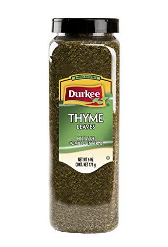 Durkee Thyme Leaves - 6 oz. container, 6 per case The dried leaf of a plant of the mint family. Flavors for this product can range from minty, pine or lemon tasting to licorice. Its color is grayish green and its leaf size is about 1/4 inch in length and 1/10 inch in width. Durkee Whole Leaf Thyme is imported from France and is of top quality. Use to flavor chowders, sausages, soups, stews, sauces, casseroles and meat loaf. Add a sprinkle to white onions, fresh tomatoes, eggplant, roasts, fish, poultry, pork chops, lamb, dips, salad dressings and cheese spreads. Use as a seasoning rub for roasts or turkey. Add to soups, stews and roasting meats at the beginning of the cooking process to release all the flavor they contain. After cooking add a sprinkle for a colorful garnish. Start by using 1/8 - 1/4 tsp. per serving and adjust from there. Durkee Whole Leaf Thyme is delicious when combined with Durkee Rosemary.