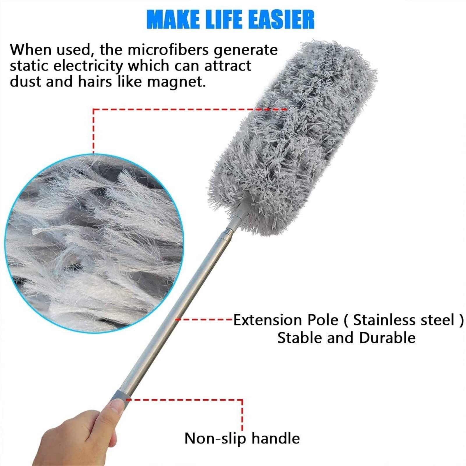 - Extra Long Extendable: No more dangerously balancing on stools trying to reach high areas. With an extendable handle that telescopes from, his microfiber feather duster is the best way to clean blinds, lighting fixtures, ceiling fans, framed pictures.