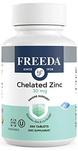 - CHELATED ZINC 30MG - 30 mg zinc chelate in tiny easy-to-swallow zinc tablets as an alternative to standard zinc capsules, zinc pills, or zinc liquid drops. Freeda's zinc glycinate chelate mineral form is easier for the body to absorb than other forms of zinc.