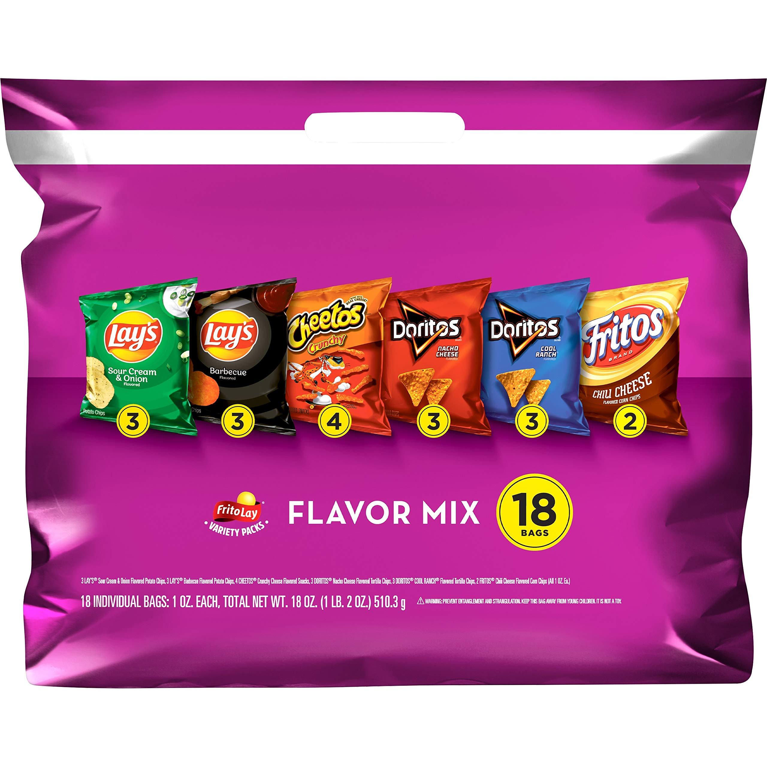 • 18 Count Mix includes 3- LAY'S Sour Cream and Onion Flavored Potato Chips, 3- LAY'S Barbecue Flavored Potato Chips, 4- CHEETOS Crunchy Cheese Snacks, 3- DORITOS Nacho Cheese Tortilla Chips, 3- DORITOS COOL RANCH Flavored Tortilla Chips, and 2- FRITOS Chili Cheese Flavored Corn Chips