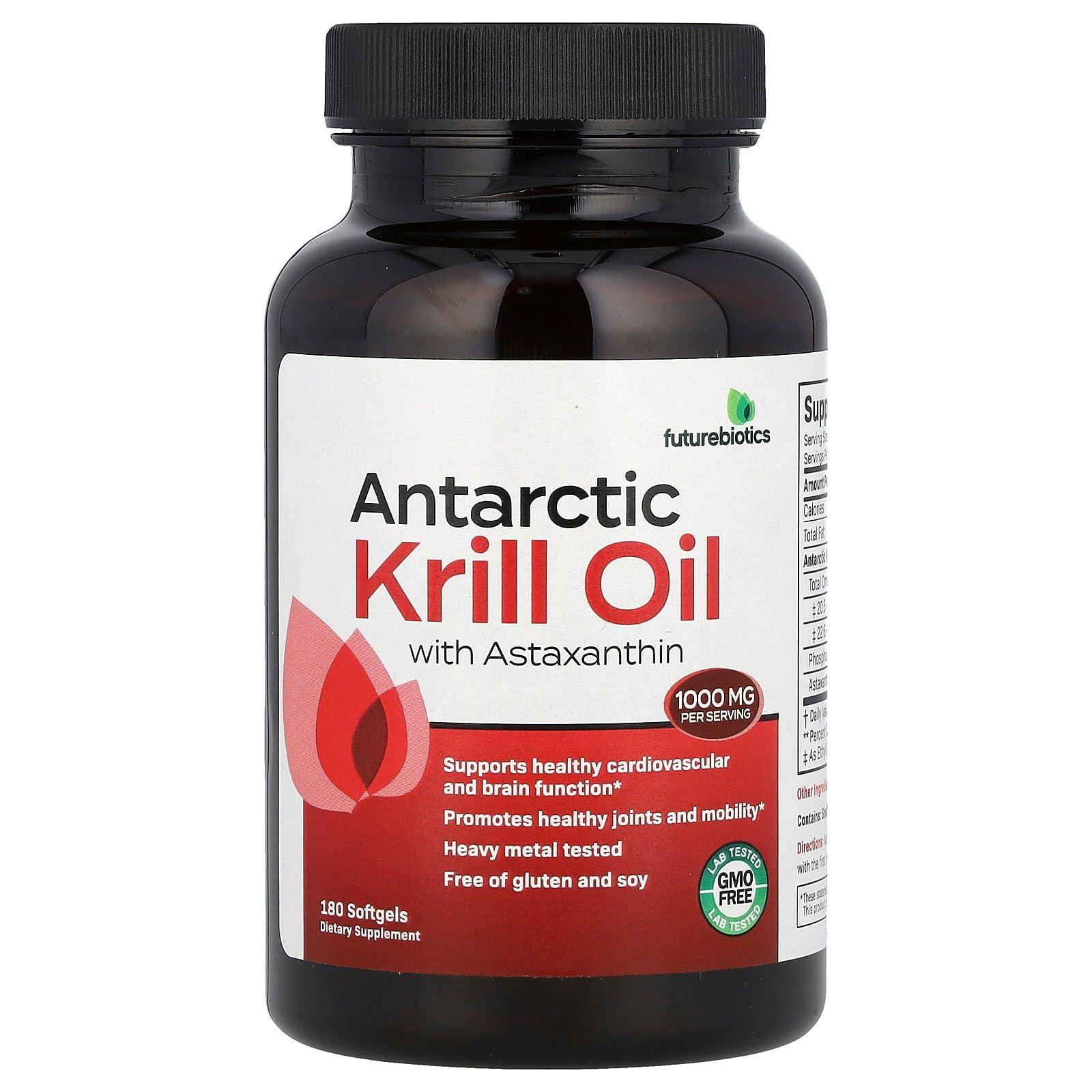 Supports Heart and Brain Health Promotes Healthy Joints and Mobility Heavy Metal Tested Free of Gluten and Soy GMO Free - Lab Tested Dietary Supplement Harvested from the fresh cold waters of the Antarctic, Futurebiotics Antarctic Krill Oil naturally provides essential omega-3 fatty acids EPA and DHA, as well as nature's powerful antioxidant known as astaxanthin. By naturally supplying these nutrients, Futurebiotics Antarctic Krill Oil supports cardiovascular health, brain function, and joints/mobility. Lab tested for purity and potency, Futurebiotics Antarctic Krill Oil provides 100% pure premium krill that is consistently harvested from the fresh Antarctic waters.