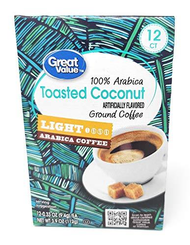 Great Value Toasted Coconut Artificially Flavored Ground Coffee - Light Arabica Coffee 12 counts Net WT 3.9 OZ (112g)