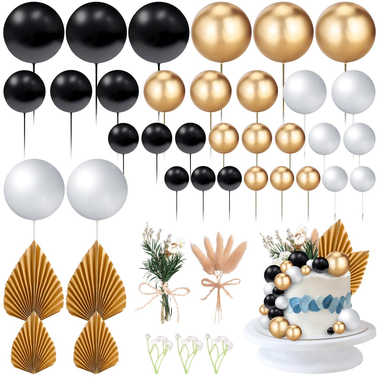 - Ball cake topper set: Includes 41 pieces in various colors and sizes: 4 paper palm fans, 3 small white flowers, 1 reed flower, 32 cake ball toppers black, gold, white, 1 small bouquet. Variety in style and quantity for all your cake decoration needs