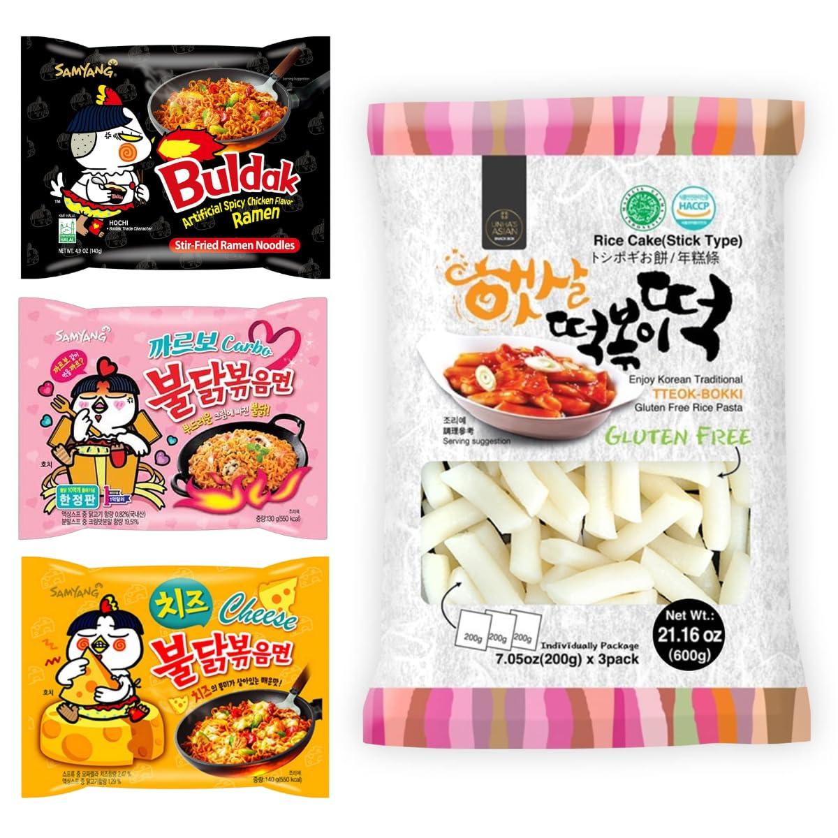 - Intense Spicy: Experience the perfect balance of heat and flavor with 3 Buldak Ramen - Regular Spicy, Cheese, and Carbonara and a Rice Cake Tteokbokki. Its signature hot chicken flavor delivers a punch of spiciness that will awaken your taste buds and keep you coming back for more.