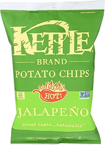 Jalapeno Kettle Brand Potato Chips have a zesty, south of the border flavor. Striking a perfect balance between fresh, well rounded flavor and the clean, spicy bite of jalapeno peppers, these all natural chips are easy to eat with a satisfying burn that sneaks up on you. Pair them with an ice cold carves and kick back with this festive, fiery flavor. Available in 1oz, 1. 5 oz., 2 oz., 5 oz., 8. 5 oz. and 13oz.