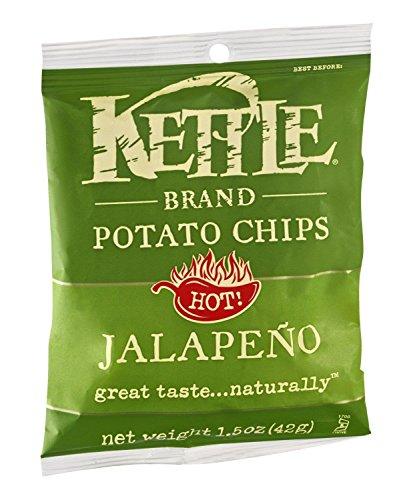 Kettle Brand Jalapeno Potato Chips, 1.5 Ounce -- 24 per case. a Fiesta. in a bag Jalapeno Kettle Brand Potato Chips have a zesty, south of the border flavor. Striking a perfect balance between fresh, well-rounded flavor and the clean, spicy bite of jalapeno peppers, these all natural chips are easy to eat with a satisfying burn that sneaks up on you. Pair them with an ice cold cerveza and kick back with this festive, fiery flavor. IngredientsPotatoes, vegetable oil safflower and/or sunflower oil, dextrose, salt, sugar, maltodextrin, onion powder, natural flavors jalapeno and green bell pepper, torula yeast, autolyzed yeast extract, garlic powder, jalapeno powder, parsley flakes, paprika oleoresin color.