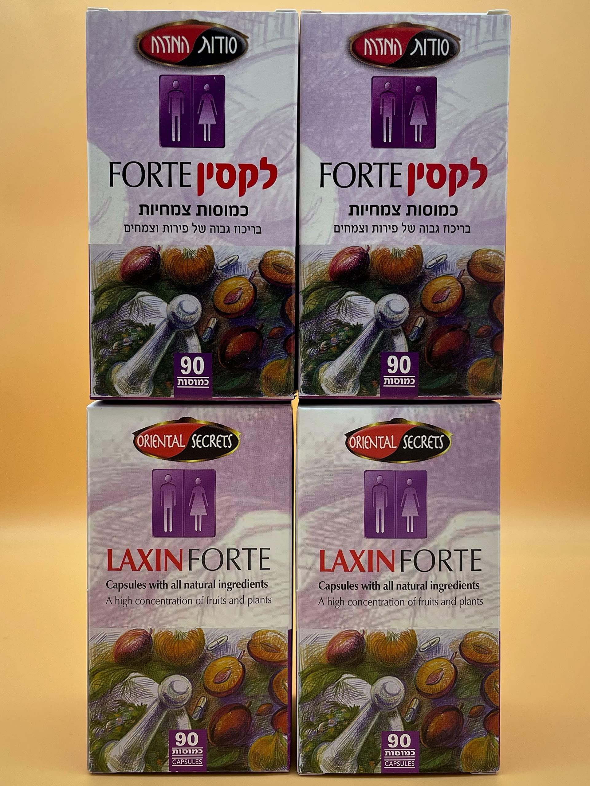 Oriental Secrets - Laxin Forte for regularity Laxin Forte capsules are an ideal, natural, safe solution for those suffering from constipation. Laxin Forte's benefits: All-natural ingredients Contains a high concentration of fruit juices and unique herbs Particularly effective No side-effects No preservatives or food coloring Ingredients: Rheum Extract 5:1, Psyllium Plantain (Plantago Afra), Prunes Extract 10:1, Fennel (Foeniculum Vulgare), Tamarind Extract 4:1 (Tamarindus Indica), Fig Extract 4:1, HPMC Capsule. Directions: 1-3 capsules (as needed) in the evening, with or after dinner. Contents: 360 (4x90) capsules Made in Israel. Kosher Pareve under the Rabbinical Supervision of Badatz Beit Yosef and Rabbanut Holon. Disclaimer: For adults only. Pregnant women, nursing mothers, and individuals taking prescription drugs should consult a healthcare professional before use. This information is not intended as medical advice and should not be considered as such. If you have a medical condition or any concerns, please seek guidance from your doctor. Barcode: 7290005169700 Shipping Weight: 0.21kg Manufactured by: Oriental Secrets - healthy supplements These statements have not been evaluated by the Food and Drug Administration. This product is not intended to diagnose, treat, cure, or prevent any disease. Pregnant or nursing women, people who take prescription medication and children must consult with a doctor. Keep out of reach of children. Do not use is outer seal is missing or damaged