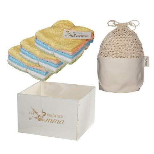 15 multipurpose wipes which allow you to replace your towels. More savings, less waste, as benefits. A washcloth is 5 sheets and towels can be reused almost indefinitely ! Washcloth is made of bamboo, a particularly absorbent material. Eco Net kit contains : 15 wipes 20x20 cm color (which can be used to differentiate between uses). An organic cotton net for washing. A wooden box PEFC certified for storage Wash: 40 C and tumble dry low authorized - 300-500 washes