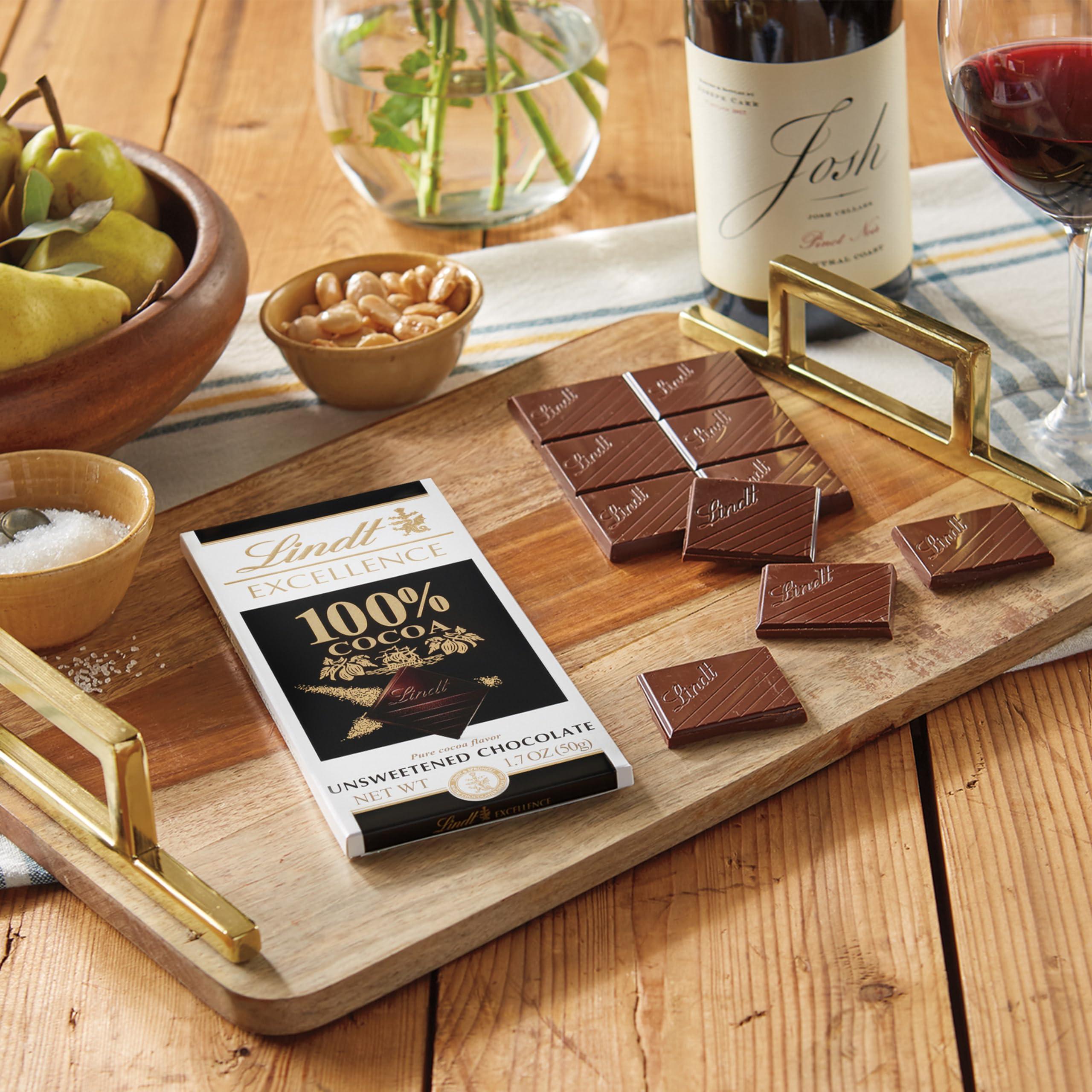 Dive into the refined richness of a Lindt EXCELLENCE 100% Cocoa Dark Chocolate Bar with all your senses. This full-bodied dark chocolate bar features a deep, dark color and attractive aroma with well-balanced cocoa notes that are robust, but not too intense, with an exceptionally silky feel. The sophisticated flavors in this dark chocolate candy bar make this gourmet chocolate the perfect pairing with cabernet sauvignon. Give a dark chocolate candy bar to your favorite chocolate connoisseur, or use them as baking chocolate for intense cocoa flavor in your premium chocolate desserts. This Lindt dark chocolate bar comes portioned into bite size squares, ensuring balanced complexity in each bite. Lindt chocolate is masterfully crafted using the highest-quality ingredients from world-renowned regions, embodying the passion and craftsmanship of Lindt Master Chocolatiers.