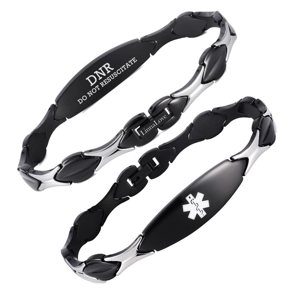 - Engraved for identify: Medical conditions is pre-engraved on the back, such as "Diabetes Type 1/2,Blood thinner,allergy,dnr,lymphedema alert ". black laser engraving, The engraving is large and in bold letters,easy to identify!You can select the applicable medical conditions through the option "Metal Type", if you need customize bracelet length and your information, such as: Name and phone number, select "Customization"