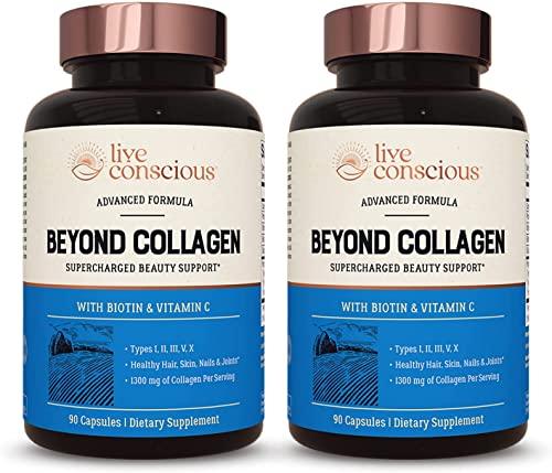 - HEALTHY SKIN, HAIR & NAIL SUPPORT: Live Conscious Beyond Collagen capsules offers 5 different types of collagen, plus biotin and vitamin C, in a convenient collagen supplement for women and men. By approaching healthy skin, hair and nail support from 5 angles, you can promote your bodys collagen levels, help you more efficiently use the collagen you have, and support the bodys natural collagen production.*