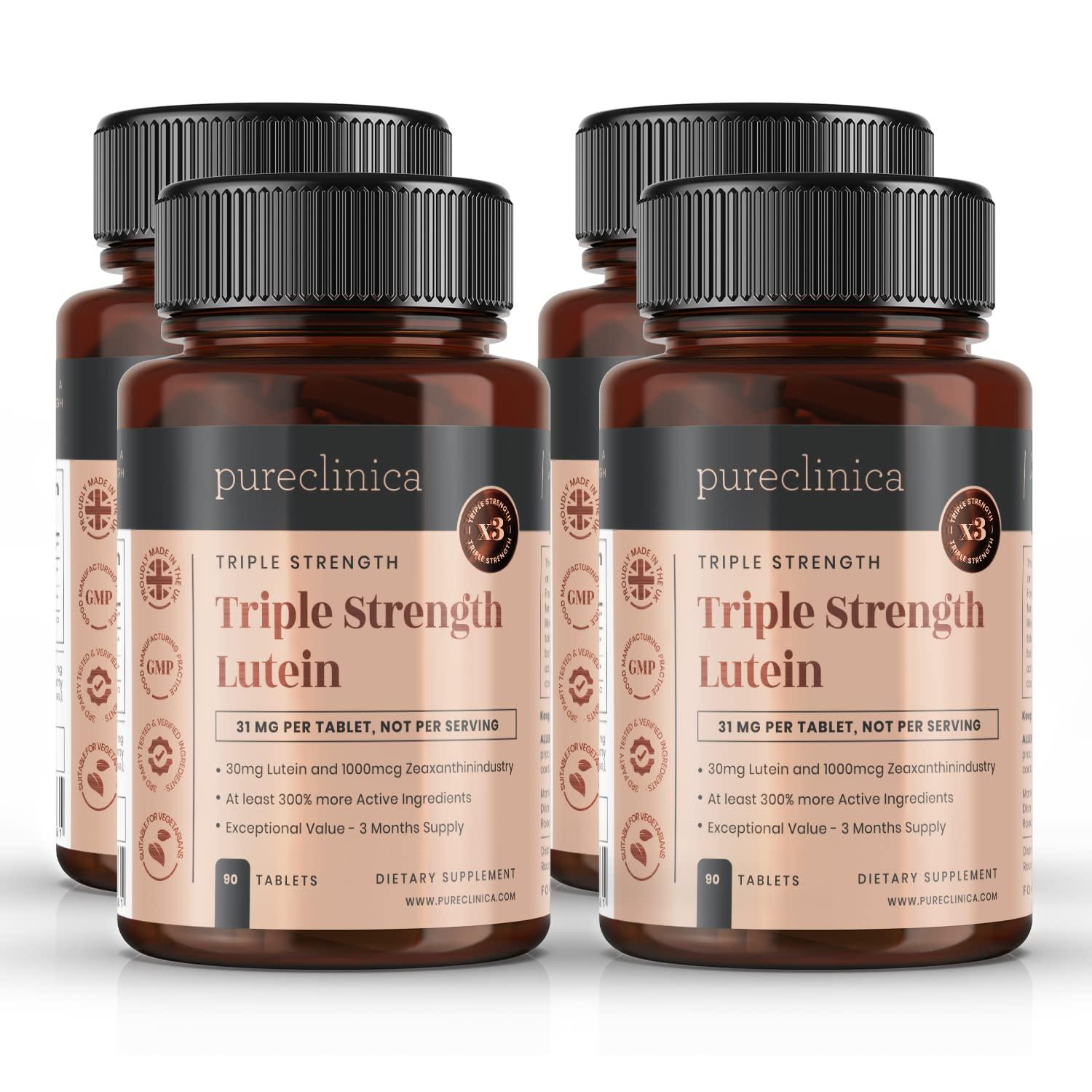 Triple Strength Lutein 30mg x 360 tablets (12 Months Supply) Triple Strength Lutein 30mg is a premium high strength Lutein and Zeaxanthin supplement. Triple Strength Lutein contains 30mg of Lutein and 1000mcg of Zeaxanthin per tablet. Standardised to ensure it contains exactly what the label states, each tablet provides an industry leading amount of the antioxidant cartenoid Lutein. At 30mg it is the strongest available. Regular Lutein tablets generally contain 10mg of Lutein making Triple Strength Lutein 30mg tablets at least three times as strong. Maximum strength, maximum potency Nobody wants to rattle like a pill box, so we made a supplement that contains a huge quantity of highly concentrated Lutein per tablet. At 30mg per tablet it is the most potent possible for maximum results and affect. 1. 30mg of highly concentrated Lutein. 2. Concentrated vegetable extract of 30mg of Lutein and 1000mcg of Zeaxanthin 3. Standardised to contain industry leading amounts of the antioxidant cartenoid. At Least 3 Times Stronger! Not all ingredients are made equal, and in creating Triple Strength Lutein we used only the most concentrated and standardised available and packed in as much Lutein as we could per tablet. Compared to other Lutein supplements, Triple Strength Lutein contains 1.5 to 3 times the active ingredient per tablet, making them far stronger and more effective. 12 Months Supply - 360 tablets Buy now for HUGE price savings. Triple Strength Lutein is available in an 12 months supply