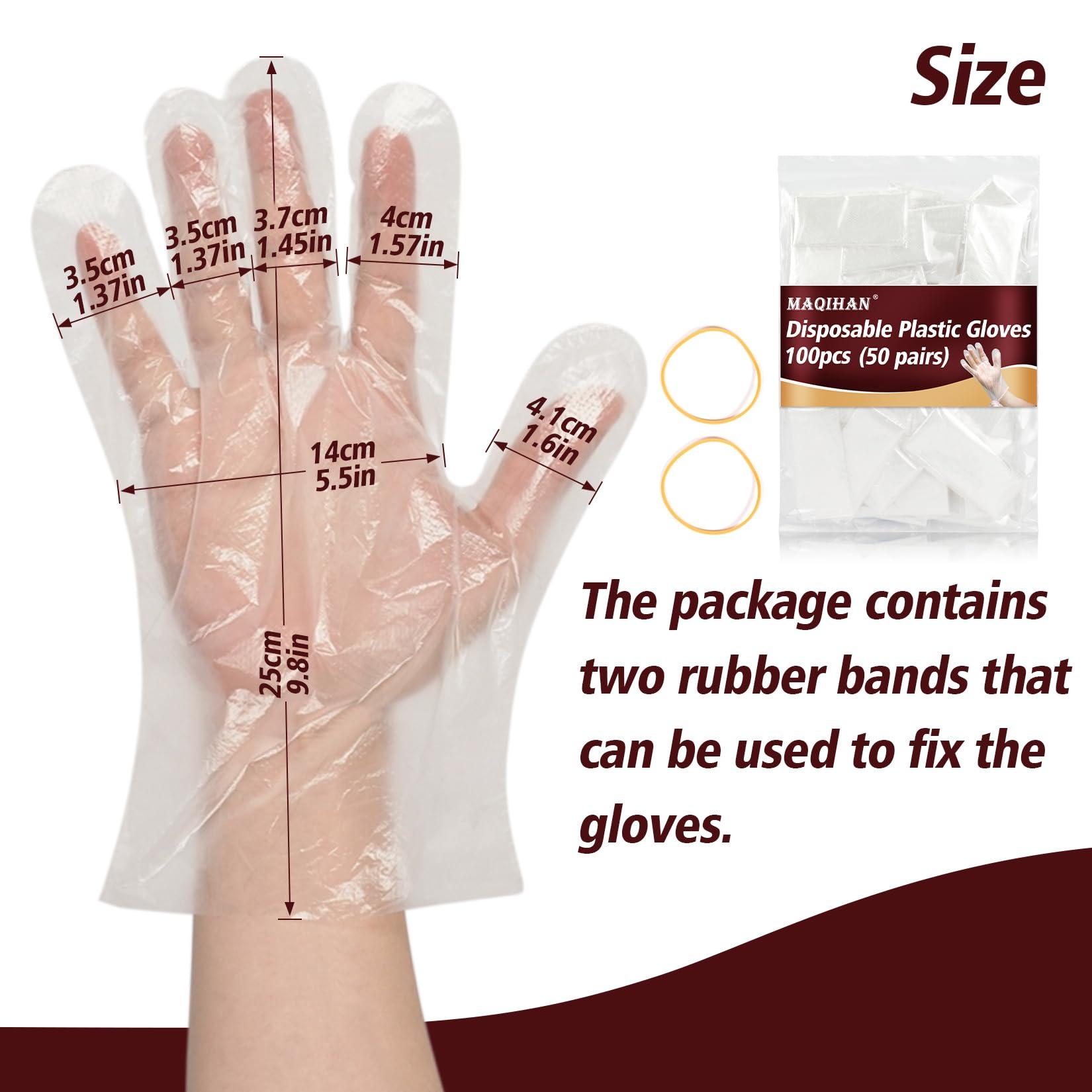 - Package Contains:50 packs food safety gloves, size 14x25 cm /5.5x9.8 in, and two rubber bands to fix the gloves.