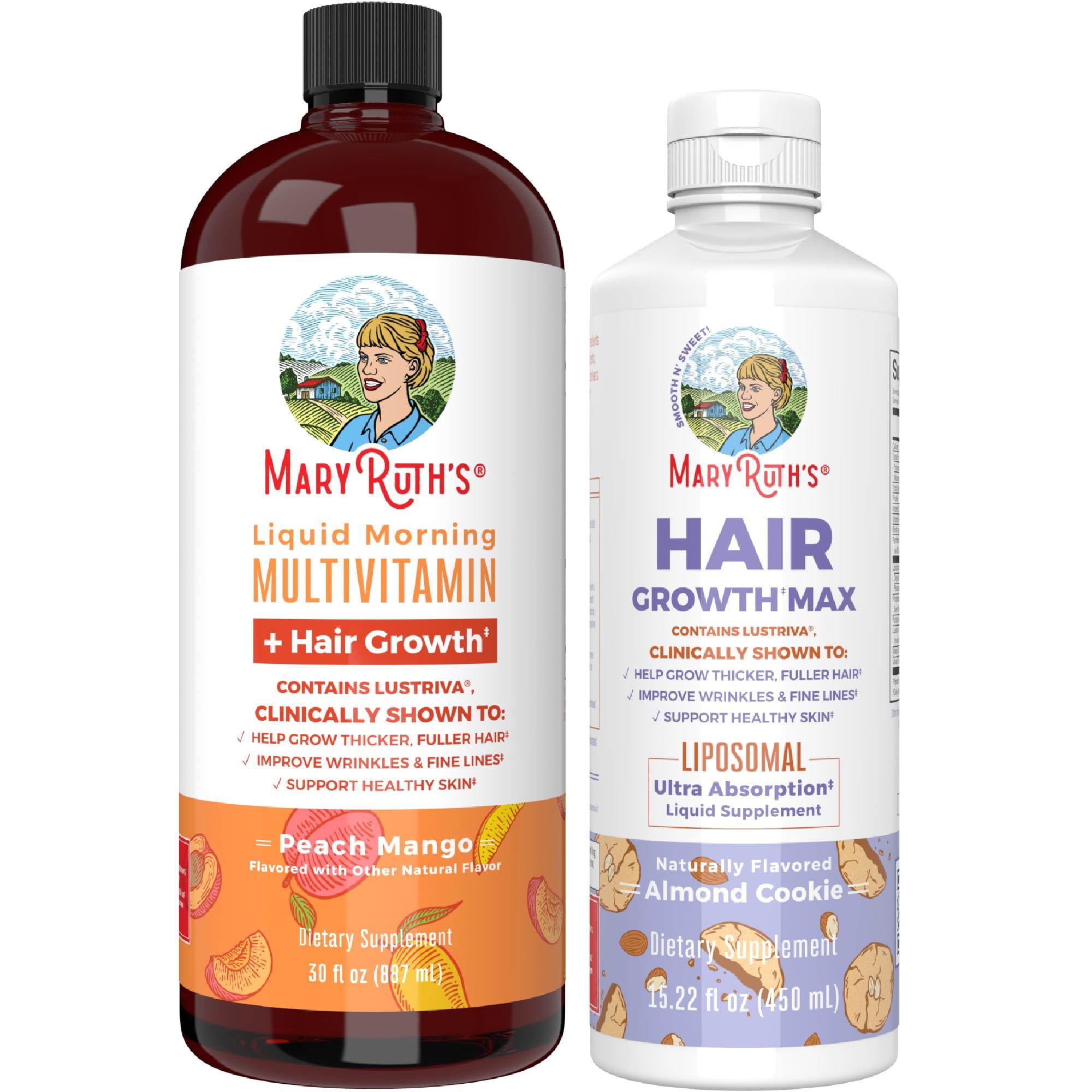 Bundle and Save and enjoy the benefits of our 2-pack product bundle consisting of MaryRuth's Liquid Morning Multivitamin + Hair Growth in Peach Mango flavor and Hair Growth MAX with Lustriva Liposomal Liquid Supplement in Almond Cookie flavor! A 2-Pack Bundle for Hair Support, Skin Health, Hair Growth, and Immune Support! All the supplements in the bundle are Vegan & Non-GMO, Gluten-Free, etc, and Made in a GMP Facility!